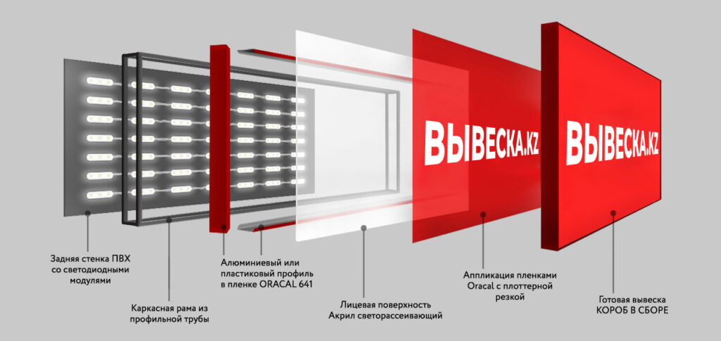 Внутри конструкции устанавливаются акриловое стекло и светодиодные кластеры, что позволяет подчеркнуть и выделить важные детали вывески.